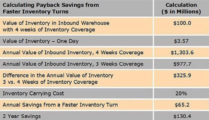 Steve Banker, Vice President of Supply Chain Services at ARC Advisory Group, published a projection of the possible cost savings associated with a faster inventory turnaround. He calculated annual savings of $65 million, and a two-year payback period from inventory savings of $130 million.