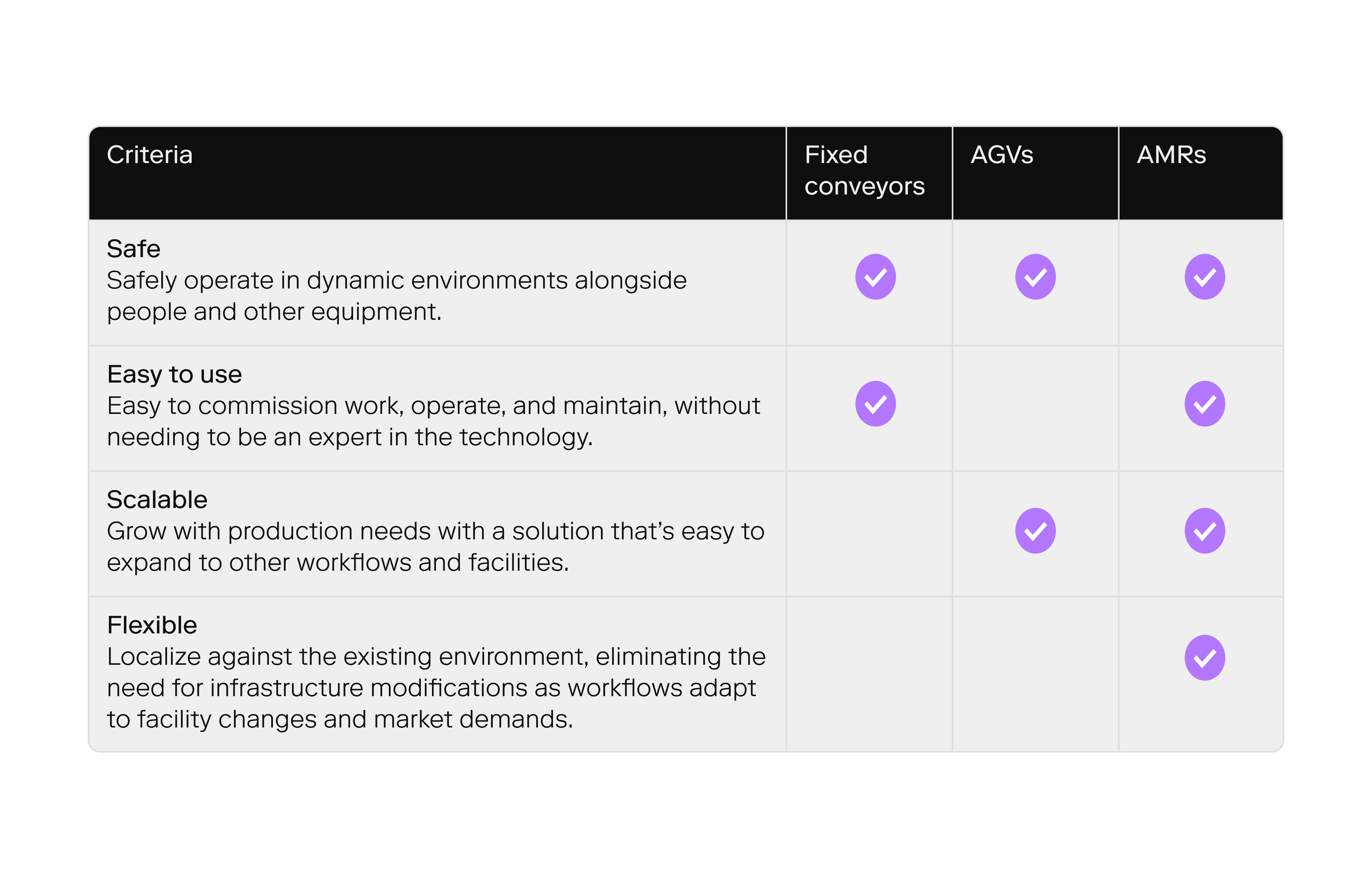 Image 1: The manufacturer’s criteria when evaluating fixed conveyor systems, AGVs, and AMRs.