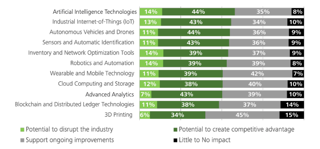 Chart 1: Adopting robotics and automation is likely to give companies a competitive advantage. The technology also has the highest potential to disrupt the market.
